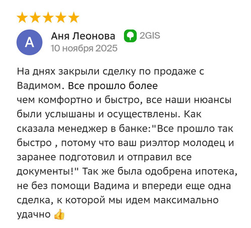 На днях закрыли сделку по продаже с Вадимом. Все прошло более чем комфортно и быстро, все наши нюансы были услышаны и осуществлены. Как сказала менеджер в банке: "Все прошло так быстро, потому что ваш риелтор молодец и заранее подготовил и отправил все документы!" Также была одобрена ипотека, не без помощи Вадима и впереди еще одна сделка, к которой мы идем максимально удачно!