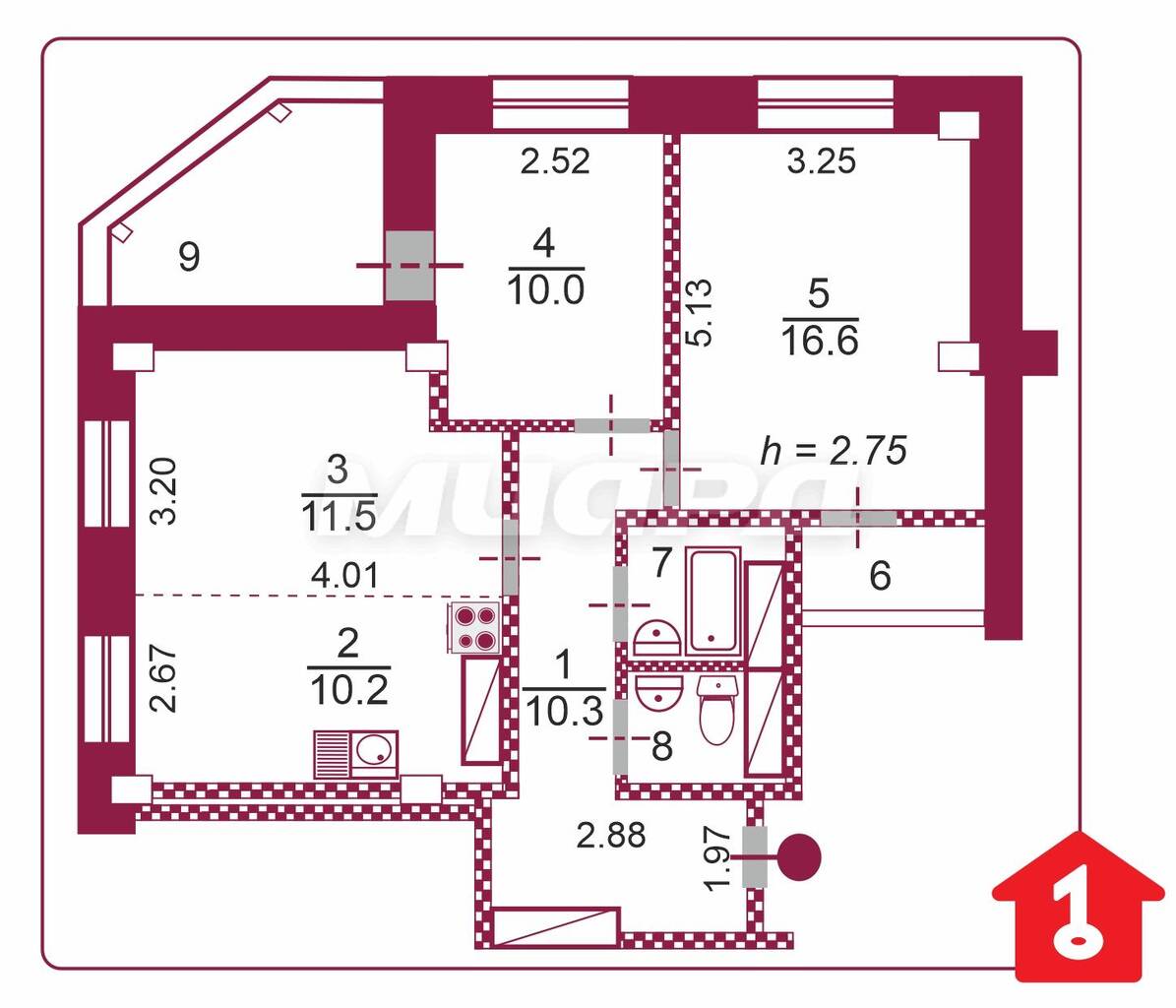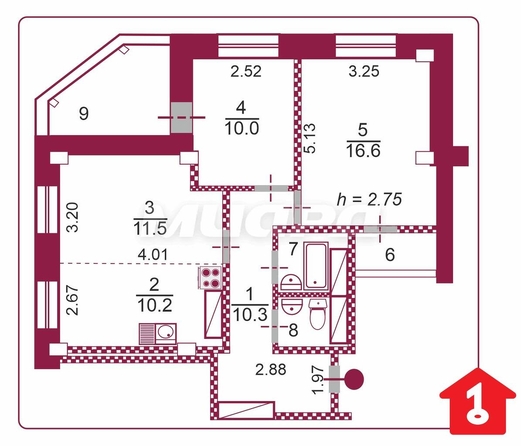 - Высота потолков: 2,75 м.