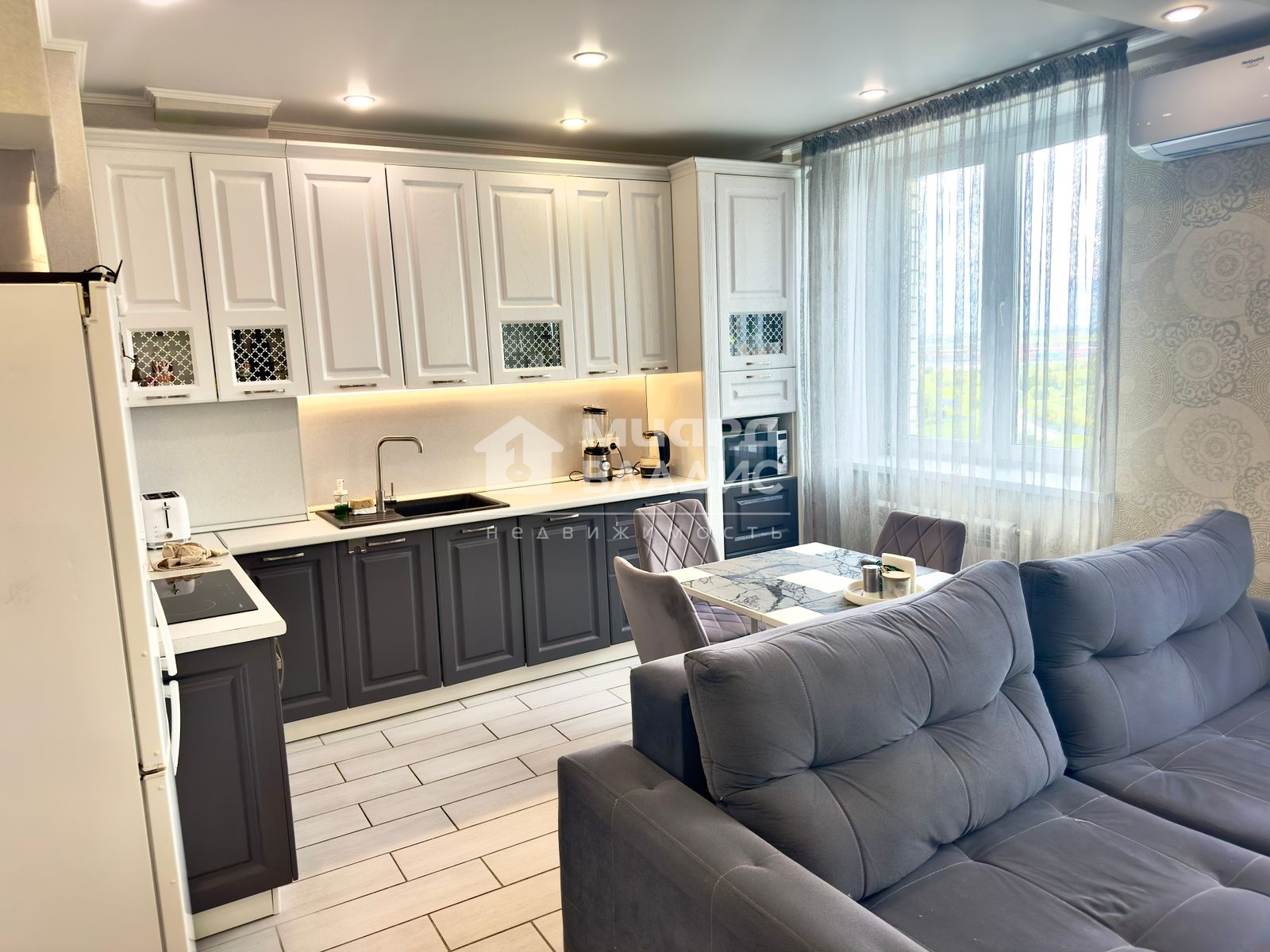 В квартире остается кухонный гарнитур со встроенной техникой, вытяжка, встроенные шкафы в коридоре, спальне, балконе, водонагреватель, кондиционер.