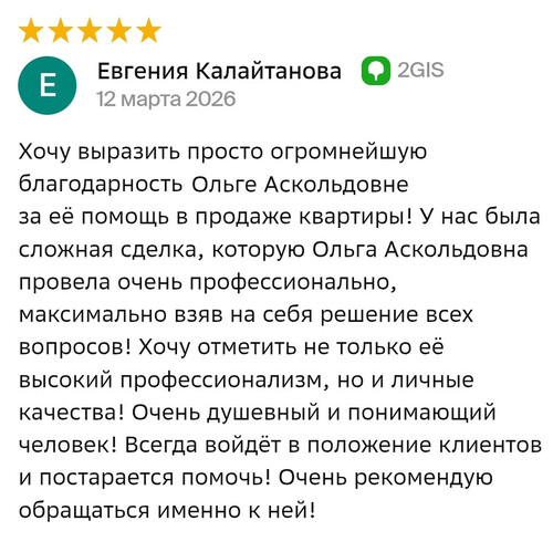 Другие отзывыХочу выразить просто огромнейшую благодарность Ольге Аскольдовне за её помощь в продаже квартиры! У нас была сложная сделка, которую Ольга Аскольдовна провела очень профессионально, максимально взяв на себя решение всех вопросов! Хочу отметить не только её высокий профессионализм, но и личные качества! Очень душевный и понимающий человек! Всегда войдёт в положение клиентов и постарается помочь! Очень рекомендую обращаться именно к ней!