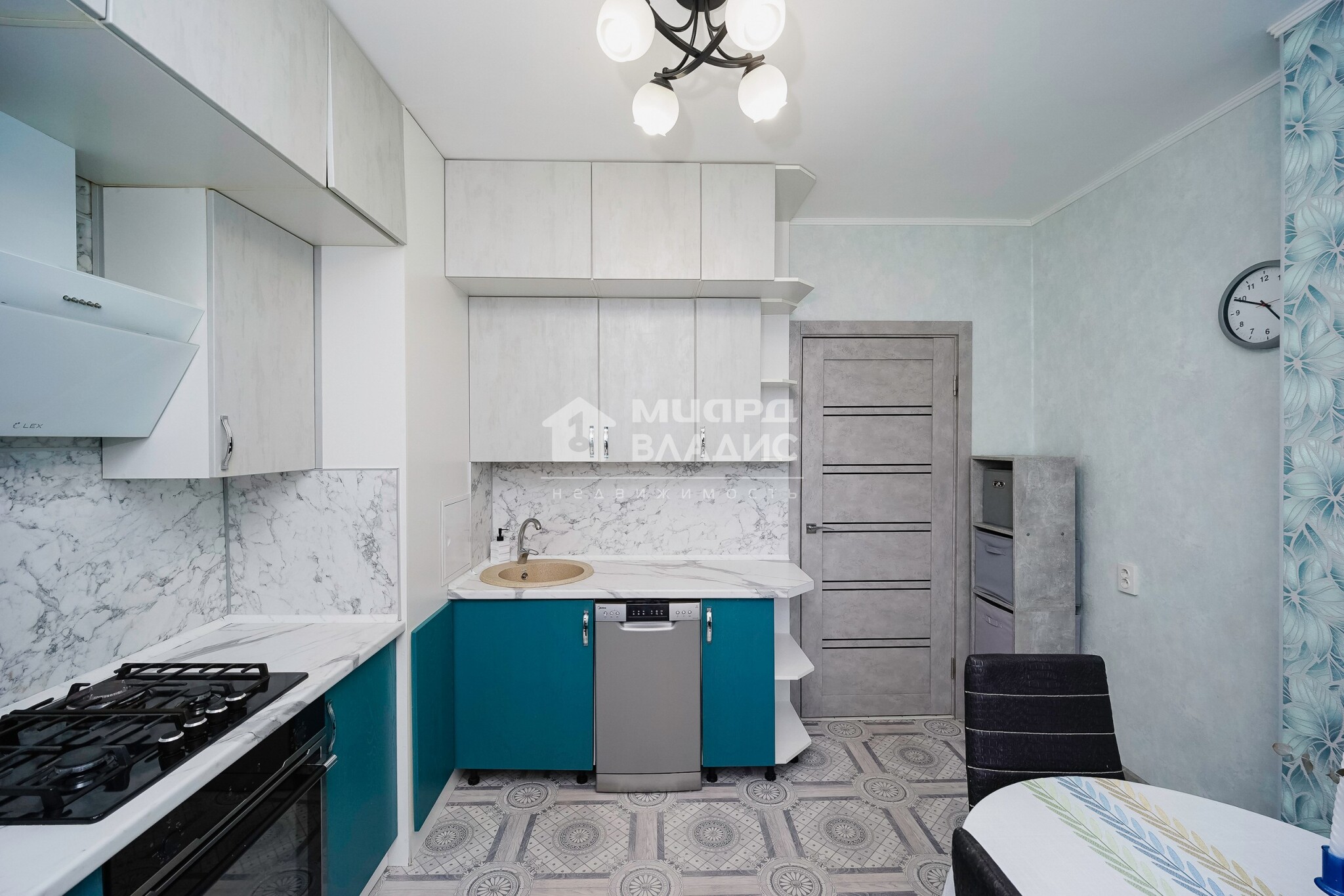 В ПОДАРОК остается встроенная кухня с вытяжкой, варочной панелью, холодильник, обеденная зона, два вместительных шкафа и диван.