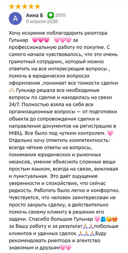 Другие отзывыХочу искренне поблагодарить риэлтора Гульнар за профессиональную работу по покупке. С самого начала чувствовалось, что это очень грамотный сотрудник, который можно ответить на все интересующие вопросы, помочь в юридических вопросах оформления, понимает все тонкости сделки! Гульнар решала все необходимые вопросы по сделке и находилась на связи 24/7. Полностью взяла на себя все организационные вопросы — от подготовки объекта до сопровождения сделки и направления документов на регистрацию в МФЦ. Все было под чутким контролем. Отдельно хочу отметить компетентность: всегда чёткие ответы на вопросы, понимание юридических и рыночных нюансов, умение объяснить сложные вещи простым языком, всегда на связи, вежливая и пунктуальная. Это даёт ощущение уверенности и спокойствия, что сейчас редкость. Работать было легко и комфортно. Чувствуется, что человек заинтересован не просто закрыть сделку, а действительно помочь своему клиенту в решении его задачи. Спасибо большое Гульнар за Вашу работу и за результат! побольше клиентов и удачных сделок! Буду рекомендовать риелтора и агентство знакомым и друзьям