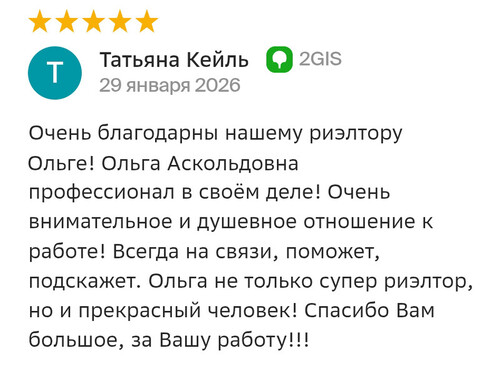 Очень благодарны нашему риелтору Ольге! Ольга Аскольдовна профессионал в своём деле! Очень внимательное и душевное отношение к работе! Всегда на связи, поможет, подскажет. Ольга не только суперриелтор, но и прекрасный человек! Спасибо Вам большое, за Вашу работу!!!