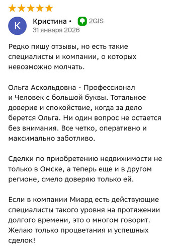 Другие отзывыРедко пишу отзывы, но есть такие специалисты и компании, о которых невозможно молчать. Ольга Аскольдовна - Профессионал и Человек с большой буквы. Тотальное доверие и спокойствие, когда за дело берется Ольга. Ни один вопрос не остается без внимания. Все четко, оперативно и максимально заботливо. Сделки по приобретению недвижимости не только в Омске, а теперь еще и в другом регионе, смело доверяю только ей. Если в компании МИАРД Владис есть действующие специалисты такого уровня на протяжении долгого времени, это о многом говорит. Желаю только процветания и успешных сделок!