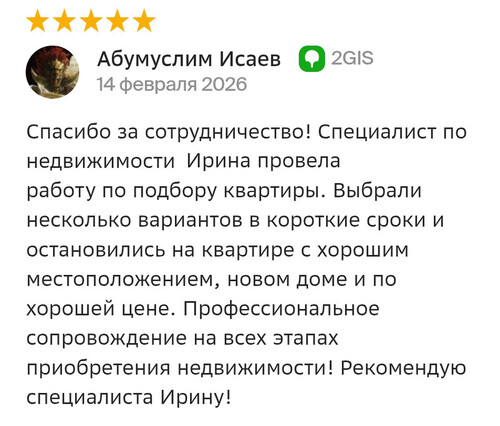 Другие отзывыСпасибо за сотрудничество! Специалист по недвижимости Ирина провела работу по подбору квартиры. Выбрали несколько вариантов в короткие сроки и остановились на квартире с хорошим местоположением, новом доме и по хорошей цене. Профессиональное сопровождение на всех этапах приобретения недвижимости! Рекомендую специалиста Ирину!