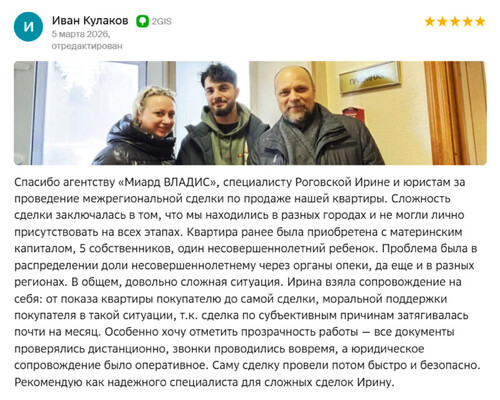 Другие отзывыСпасибо агентству МИАРД Владис, специалисту Ирине и юристам за проведение межрегиональной сделки по продаже нашей квартиры. Сложность сделки заключалась в том, что мы находились в разных городах и не могли лично присутствовать на всех этапах. Квартира ранее была приобретена с материнским капиталом, 5 собственников, один несовершеннолетний ребенок. Проблема была в распределении доли несовершеннолетнему через органы опеки, да еще и в разных регионах. В общем, довольно сложная ситуация. Ирина взяла сопровождение на себя: от показа квартиры покупателю до самой сделки, моральной поддержки покупателя в такой ситуации, т.к. сделка по субъективным причинам затягивалась почти на месяц. Особенно хочу отметить прозрачность работы — все документы проверялись дистанционно, звонки проводились вовремя, а юридическое сопровождение было оперативное. Саму сделку провели потом быстро и безопасно. Рекомендую как надежного специалиста для сложных сделок Ирину.