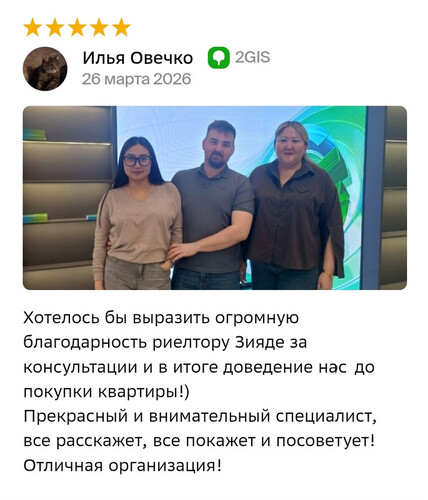 Хочу выразить огромную благодарность риэлтору Зияде! У нас было много трудностей при покупке квартиры, процесс оказался непростым, но Зияда справилась со всем на высшем уровне. Она всегда была на связи, подробно объясняла каждый этап, помогала решать все возникающие вопросы и поддерживала нас до самого конца сделки. Очень чуткий, отзывчивый и ответственный человек, которому действительно можно доверять. Благодаря ей мы прошли этот путь спокойно и уверенно. Если вы планируете покупку квартиры, то смело обращайтесь к Зияде.
