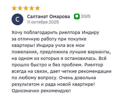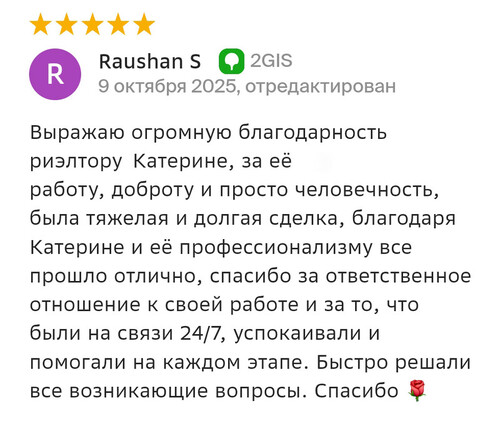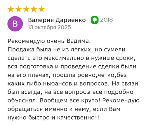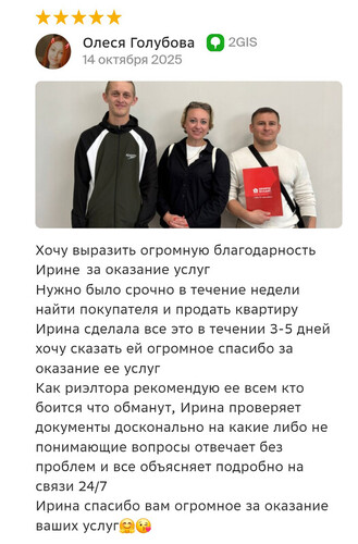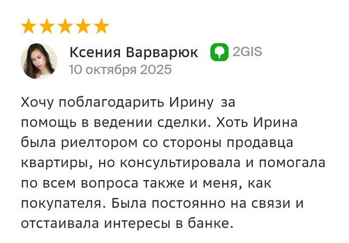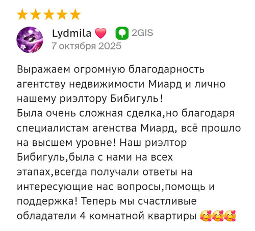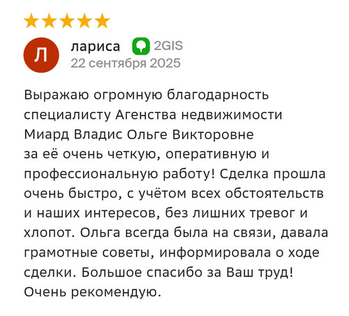 Благодарю компанию Миард Владис за профессионализм! Работала с агентом Людмилой, очень довольна результатом, хоть и процесс продажи недвижимости не исключает порчу нервных клеток. С момента обращения до сделки прошло 1,5 месяца!!! Знаю, что результат зависит не только от агента, а от всей команды, поэтому благодарю коллектив компании за сплоченность, компетентность, нацеленность на результат! Людмила, благодарю вас за труд и терпение, желаю, чтобы позитив и добро, которые вы дарите клиентам, возвращалось к вам многократно!