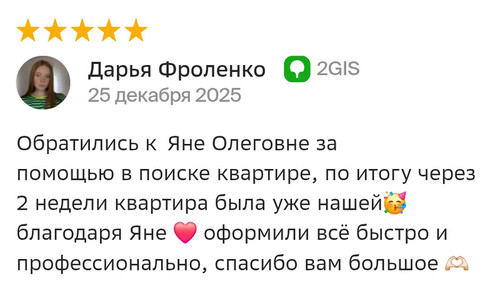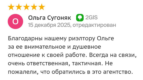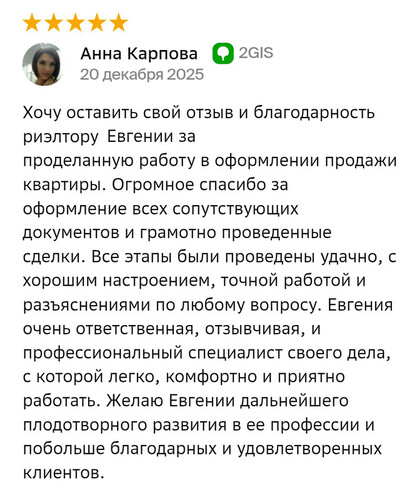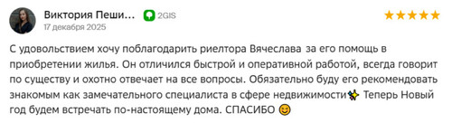 Второй раз за 1,5 года покупаем квартиру через агентство недвижимости МИАРД Владис. И, конечно, вернулись к нашему риелтору Олесе. Сделка была с Питерским застройщиком и маткапиталом, но эти казалось бы сложности оказались простыми, так как Олеся всегда была на связи (а это сейчас сложно) поддерживала и делала все возможное, чтобы на всех этапах все было хорошо. Сделка прошла в октябре, а вовлеченность есть до сих пор (это касается и прошлой сделки), можно посоветоваться спросить как лучше или как не надо, приятно работать с человеком, который ценит клиентов отстаивает ИХ интересы, не проподая после подписания дду. Олеся не только талантливый риэлтор, но и прекрасный человек. Ждите нас снова! Мы только к вам!